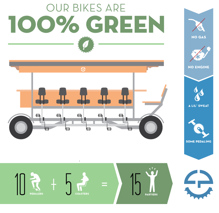 The Cycle Party group bike seats 15 riders and the Cycle Party driver. As a 15-person quadracycle, Cycle Party is perfect for any celebration and all social outings, including: birthdays, bachelor/bachelorette parties, ice cream socials, fund-raisers , church outings, progressive dinners, sightseeing, tailgating, pub crawls, singles mixers, parades (we are an instant float!) or YOUR VERY OWN REASON!